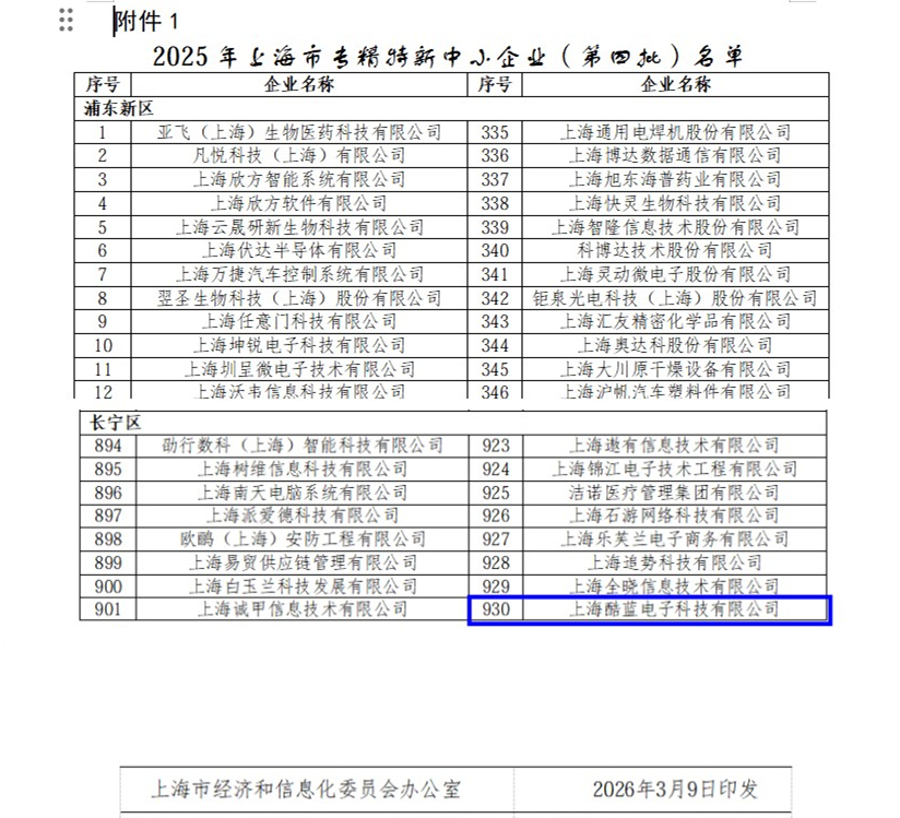 上海酷蓝电子荣获2025年上海市专精特新中小企业